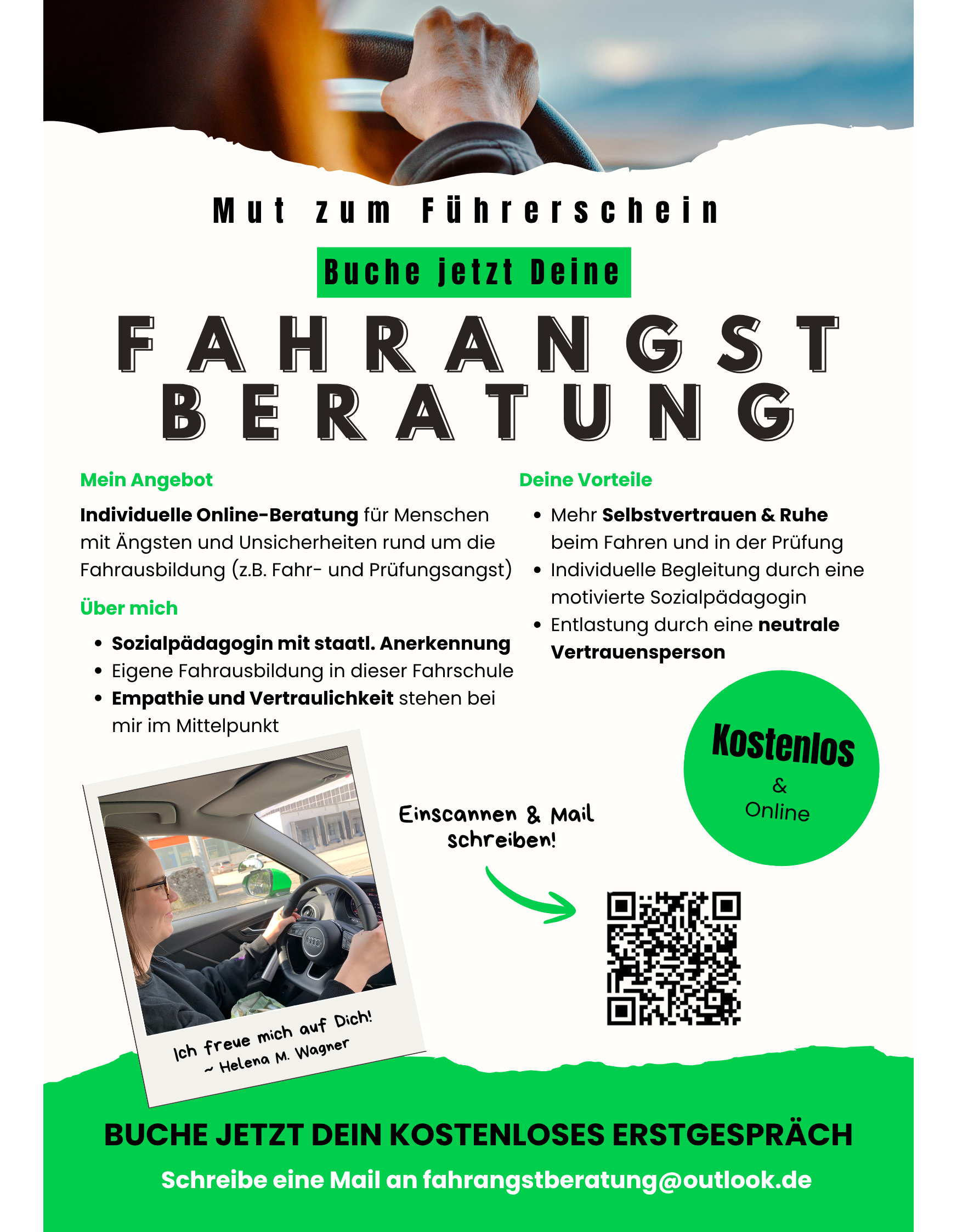 Die Sozialpädagogin Helena Wagner berät online bei Ängsten und Unsicherheiten rund um die Fahrausbildung bzw Fahrprüfung.